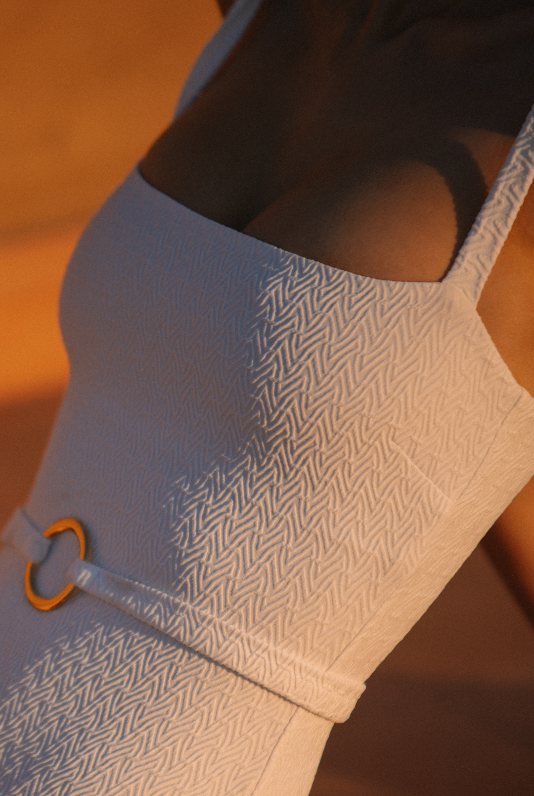 A timeless, luxuriously soft one-piece crafted with an exclusive textured fabric. The Hamptons swimsuit features the most flattering cut, with a built-in-bra shelf for extra support and comfort. The high cut leg elongates the body, whilst the removable belt makes a statement with gold hardware detailing. Made with Q-NOVA® by Fulgar - an innovative exclusive texture derived from recycled materials.