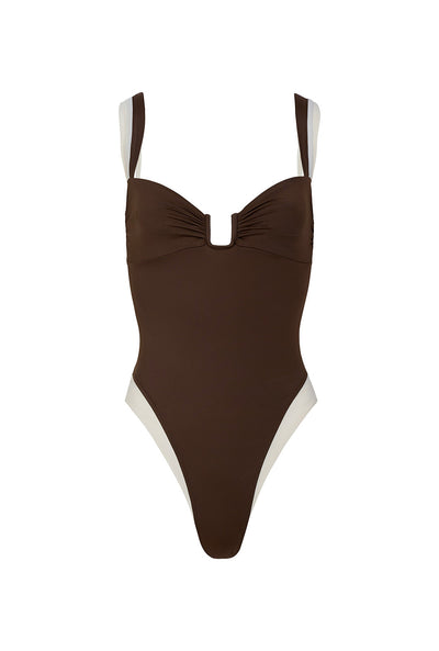 Inspired by the classic 90's - This iconic, figure-flattering design features a balconette aesthetic and an exclusive two-tone colourway with an Espresso base and ivory panels, boasting a timeless look with medium coverage at the back. Complete with fully adjustable straps and a high-cut leg, perfected to wear as a swimsuit or bodysuit. Featuring a high cut leg to elongate your pins.