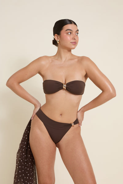 This beautiful bandeau top is made with our buttery 'Soft Touch' material - It's wonderfully light weight and stretchy whilst giving you excellent hold. Featuring elevated gold twist hardware at centre front with removable padding. It also features side boning for structure and gripper tape on the inside to avoid any slipping. Perfect for minimal tan lines and a chic look. Pairs perfectly with the Formentera Bottom in Espresso.
