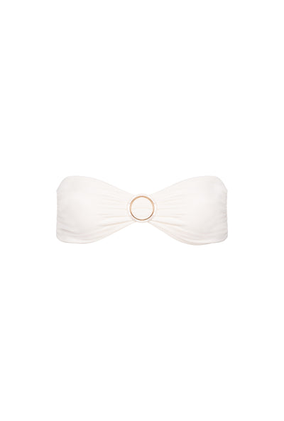 This elevated bandeau style features hidden gripper tape on the inside to ensure your top stays in place. Featuring a gold / Pearl-like ring at centre front for timeless, understated glamour. Complete with a tie-back for adjustability and side boning for support - it’s the perfect top for minimal tan lines.