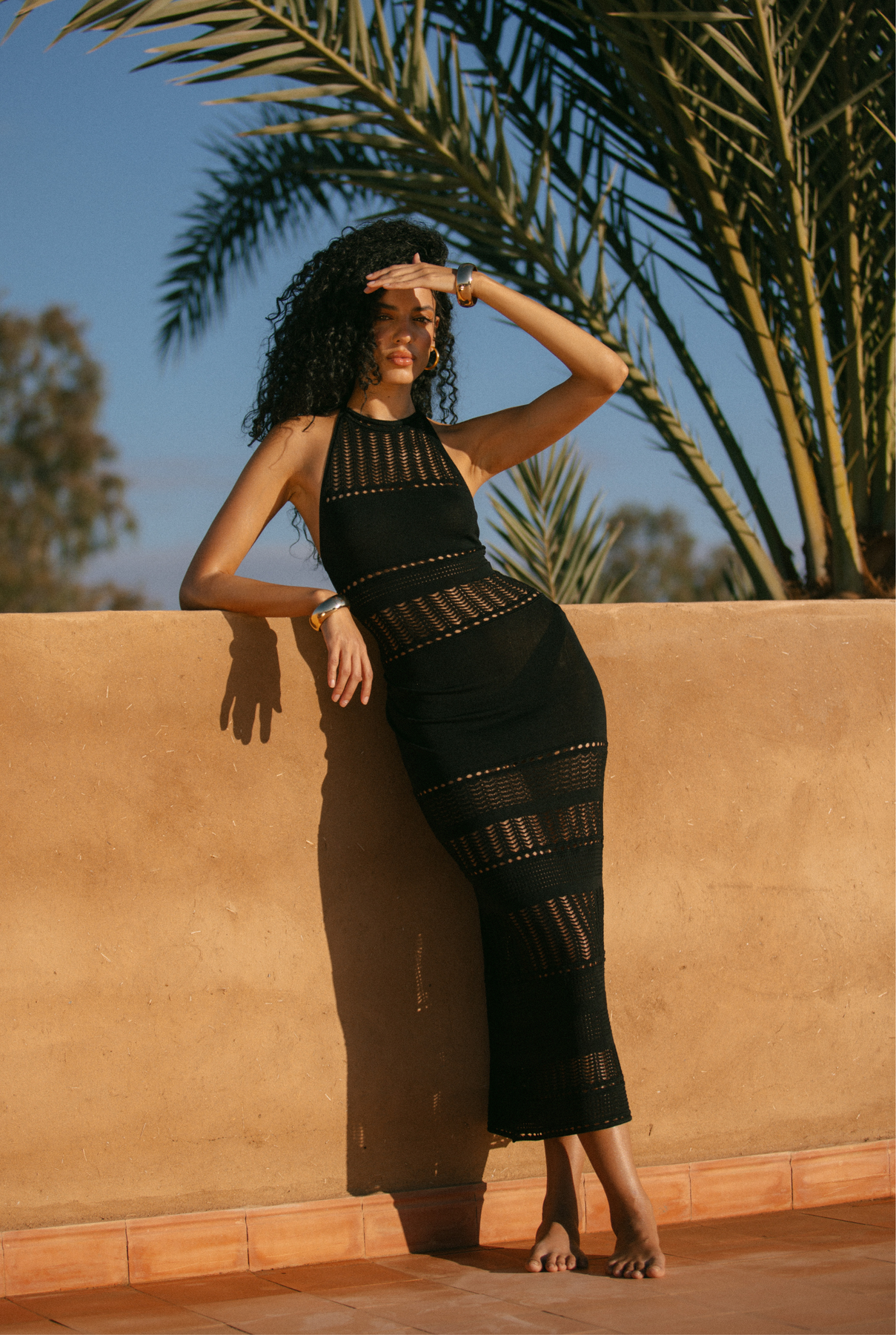 A multi-knit design that effortlessly slips on and hugs your figure. Designed to be less sheer around the bust and hips, this dress is the perfect day-to-night staple piece. Features adjustable neck ties and a low back design. Can be styled over a bikini top as a coverup or without as a stand-alone dress.