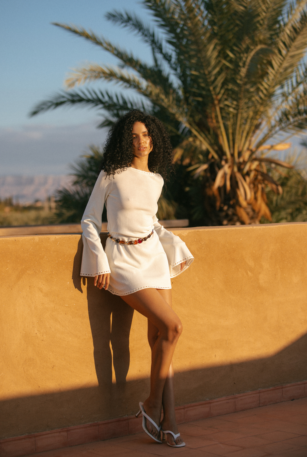 Designed with a fine, soft knit and a loose, effortless silhouette - The Mahe mini dress features long bell sleeves, a boat neckline and an ultra-low scooped back. Complete with adjustable neck ties to hold the dress in place, this dress is perfectly worn loose or styled with a belt. Semi-sheer knit. *Belt in pictures is stylists own.