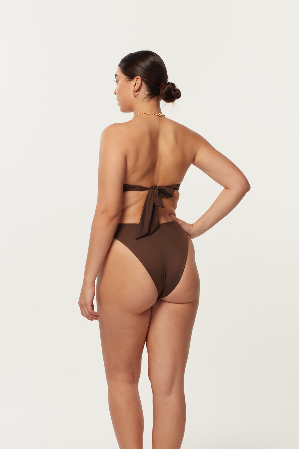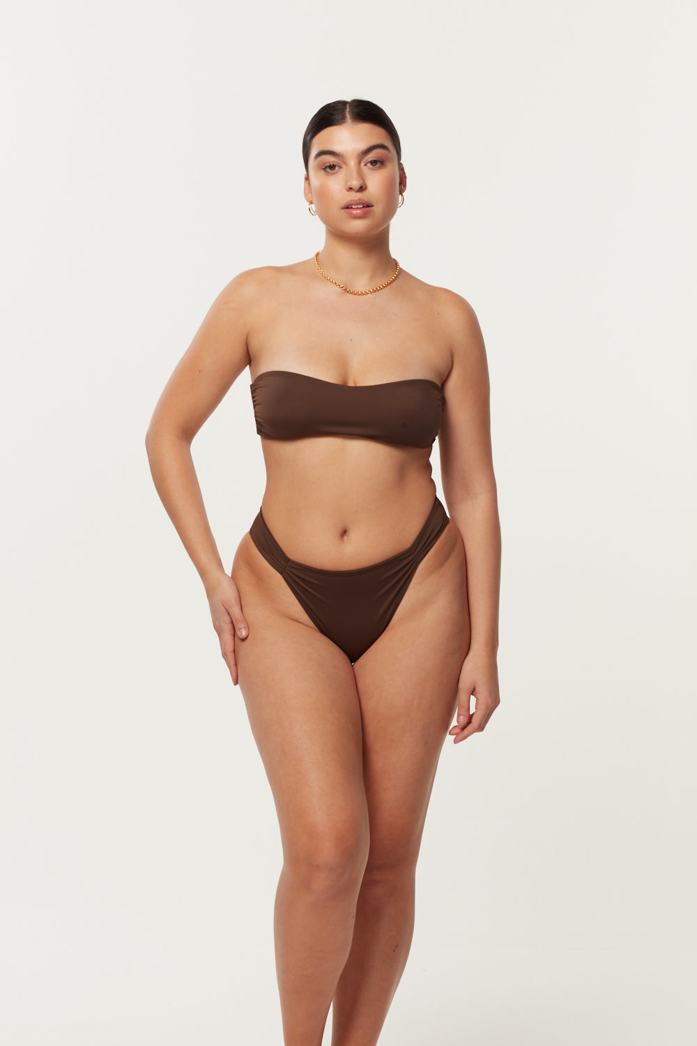 An updated, timeless classic with over-sized side straps and medium coverage at the back. The Palma Bottom can be worn as a high-rise or mid-rise bottom and features beautiful gathered front and back detailing. Designed with a seamless finish and a flattering high cut leg.