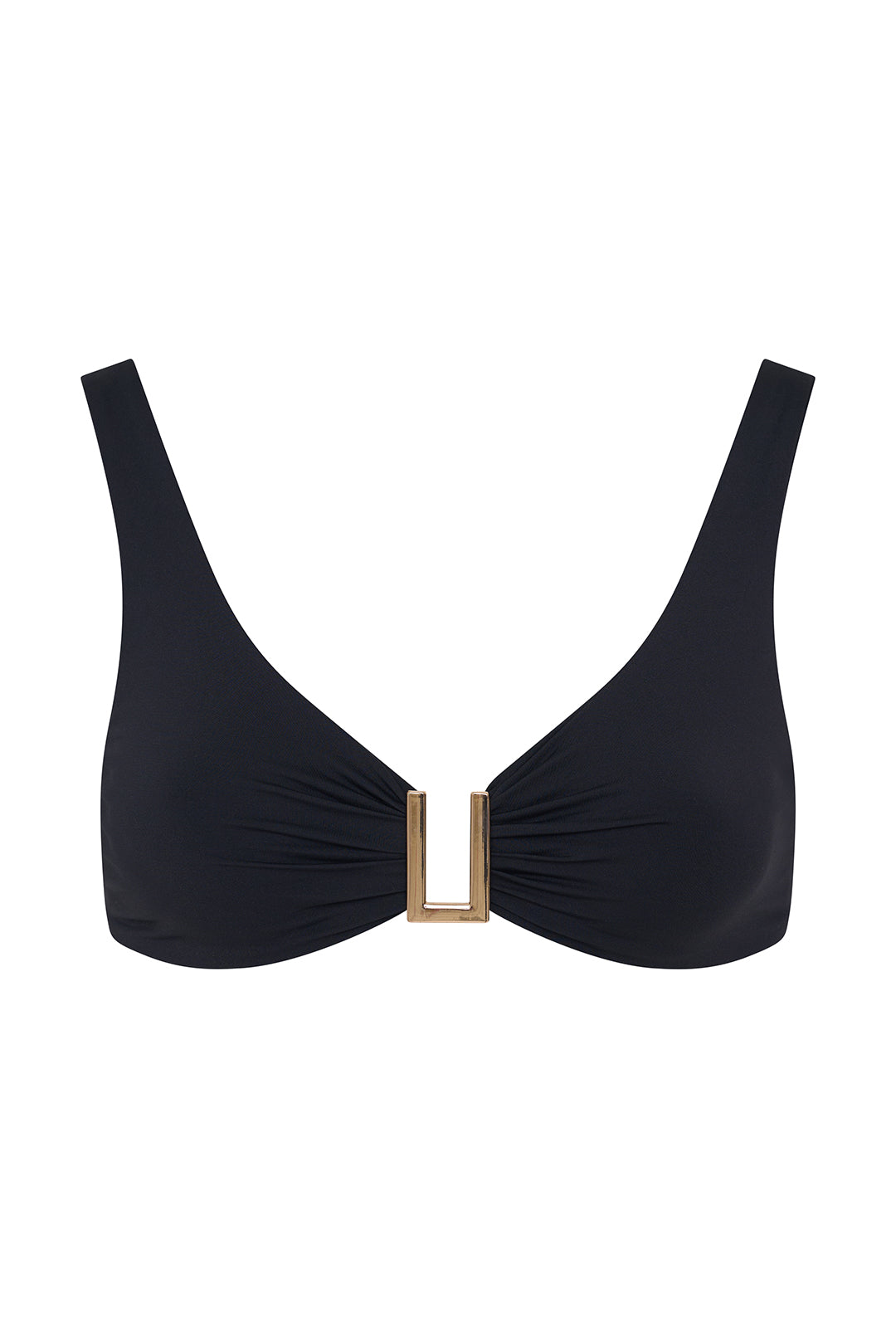 Our Porto Cerve top combines a supportive, flattering cut with luxurious gold detailing. Featuring statement U-shaped hardware at the centre front with fully adjustable straps, this style also comes with adjustable back ties for the ultimate custom fit.