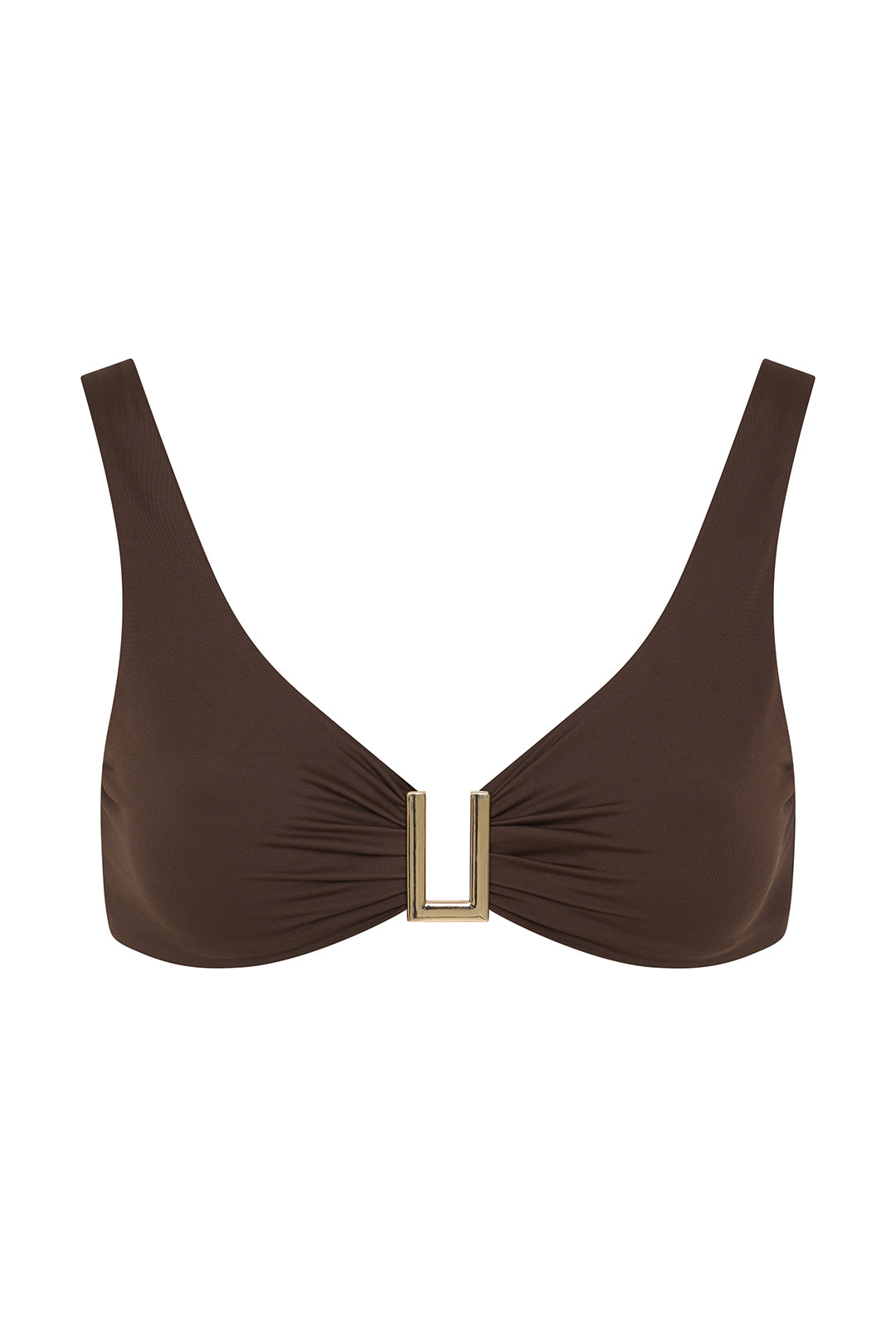 Our Porto Cerve top combines a supportive, flattering cut with luxurious gold detailing. Featuring statement U-shaped hardware at the centre front with fully adjustable straps, this style also comes with adjustable back ties for the ultimate custom fit.