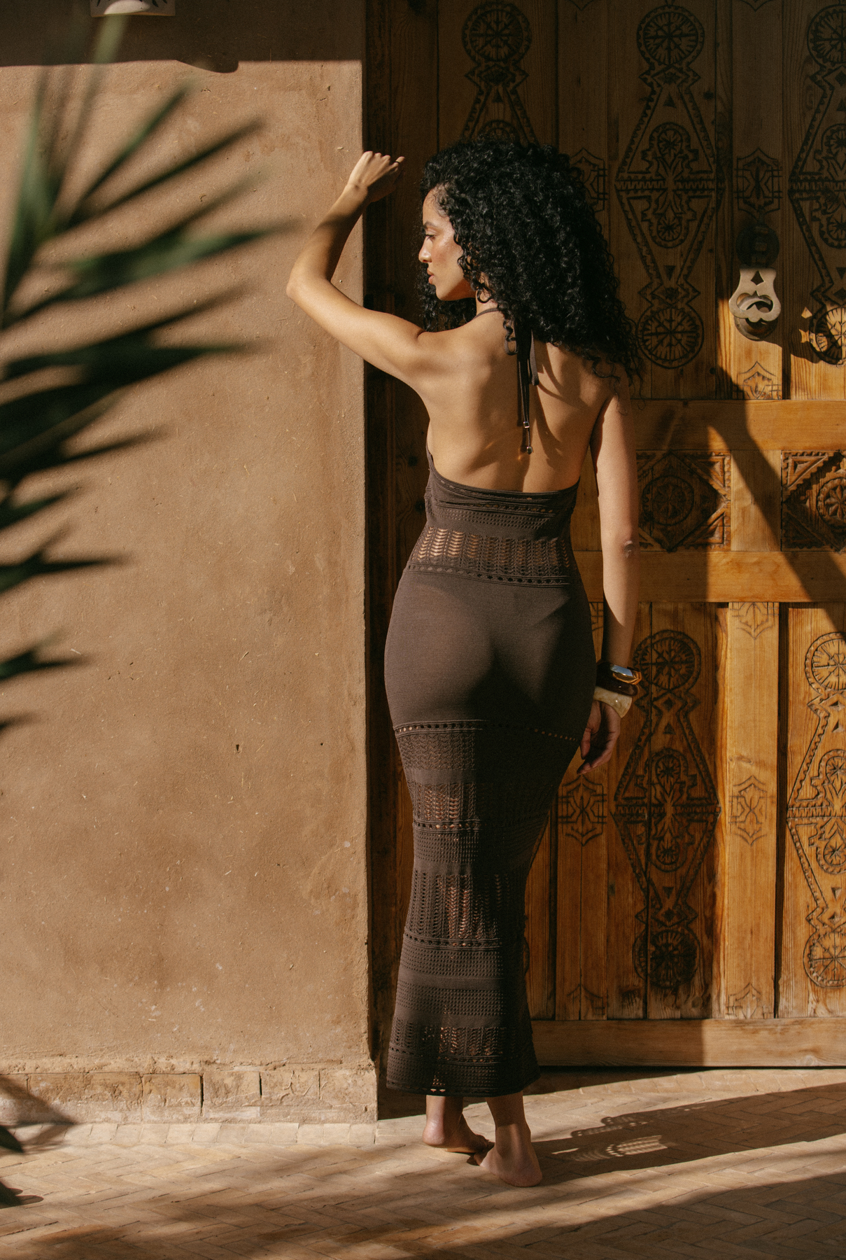 A multi-knit design that effortlessly slips on and hugs your figure. Designed to be less sheer around the bust and hips, this dress is the perfect day-to-night staple piece. Features adjustable neck ties and a low back design. Can be styled over a bikini top as a coverup or without as a stand-alone dress.